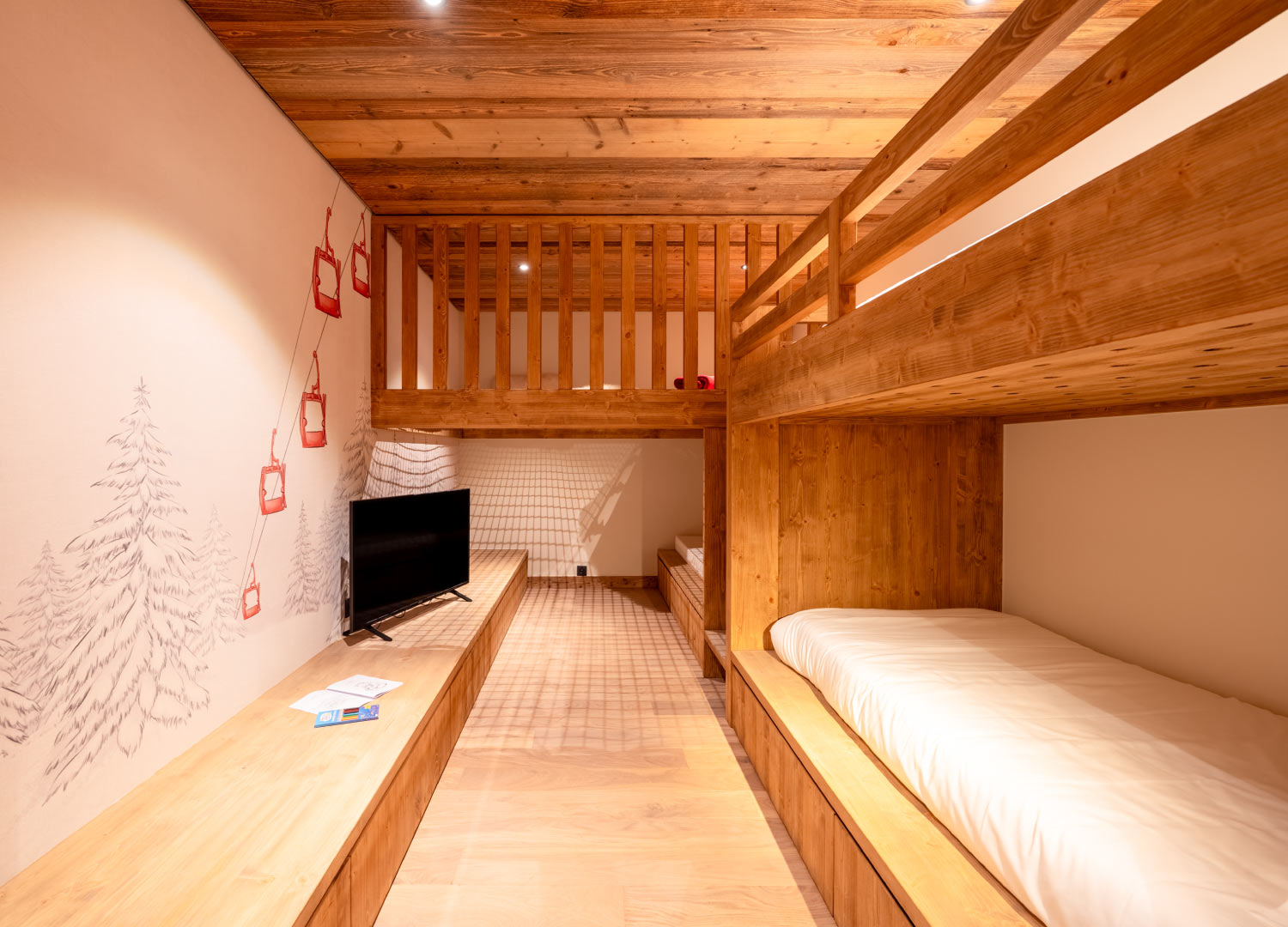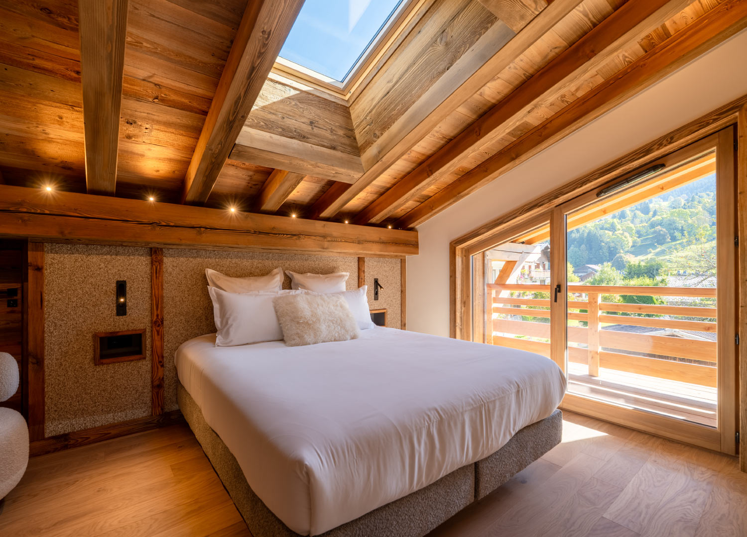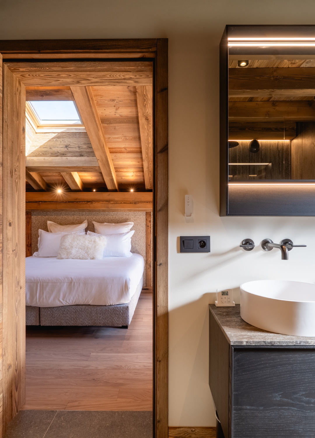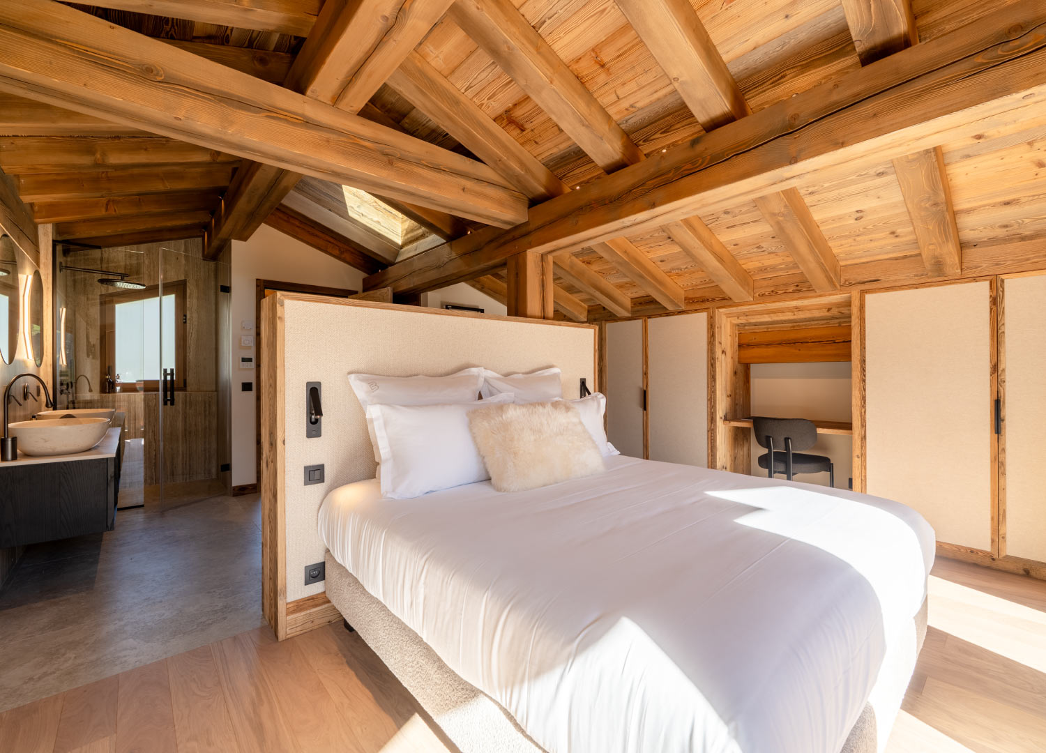 Quand la journée se termine, le chalet devient un refuge. Les chambres ont été pensées comme de véritables bulles de repos : ambiance douce, literie confortable, et une décoration et des matériaux qui privilégient la sérénité. On s’endort au calme, on se réveille face aux montagnes.